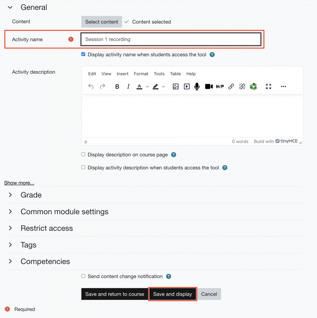 Add a name for the recording in the Activity name field (this will automatically take the name of the recording file). Click Save and display to complete the process.