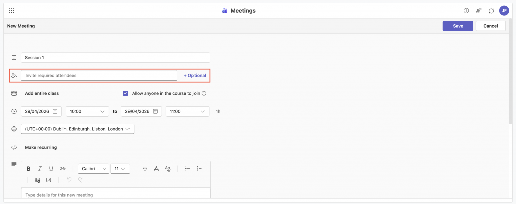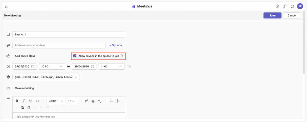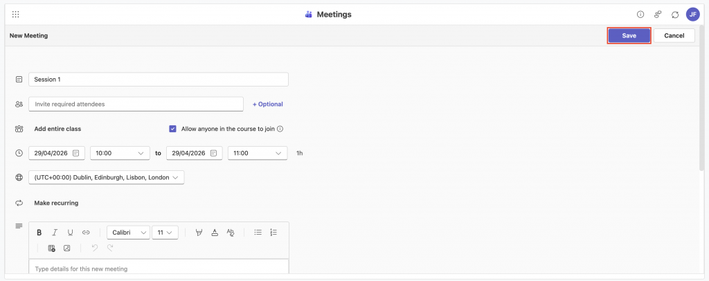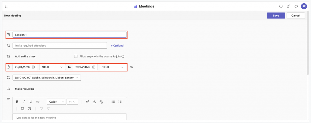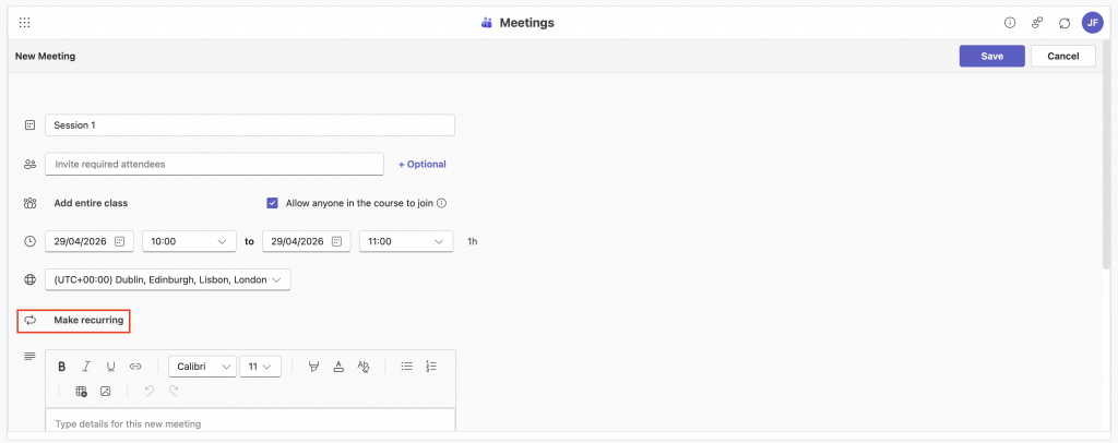 Choose whether you want a single or recurring session. If recurring, click Make recurring and set the recurring times/dates